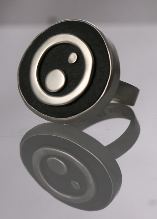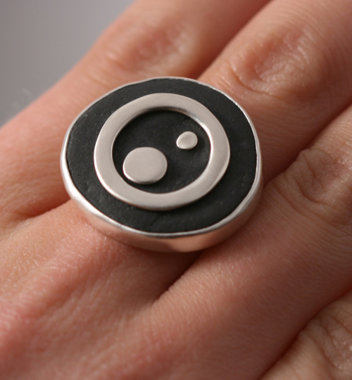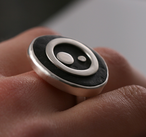 In the end though, I think it’s a very successful ring. It feels great and looks very cool. I love the shiny smooth silver against the dark matte of the stone. As usual, Selma is modeling the ring.