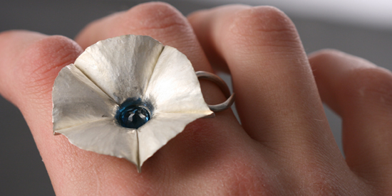 The ring shank is forged sterling silver, made to resemble a stem. I set a 6mm London blue Topaz in the flower. I wanted the blue of the topaz to reflect inside the flower, so I set the stone upside down. That was about the hardest part of this ring, but all in all not that hard. I kind of made it up, a cross between a tube and bezel setting.